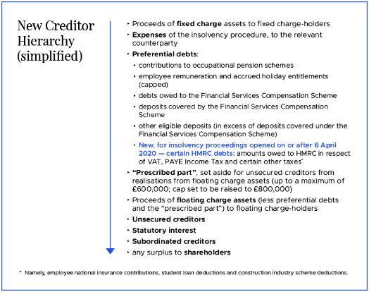 - HMRC as preferential creditor: From April 2020, HMRC will become a preferential creditor for certain debts relating to taxes paid by employees and customers. HMRC's priority status is expected to reduce returns for floating charge and unsecured creditors, which may reduce appetite for lending and increase funding costs for UK companies, and lead to greater recourse to fixed charge and asset-based lending.