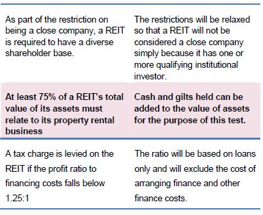The REIT regime was launched in 2007, with the aim of creating a tax efficient vehicle in which to encourage investment into Real Estate. However, with only a limited number of companies making the conversion to REIT status, the Government has sought to improve the regime by reducing barriers to entry, encouraging investment into REITs and reducing the costs of complying with the regime. The Finance Bill 2012, which received Royal Asset on 17 July 2012 has brought in a number of changes which are designed to meet these aims, the most pertinent of which are listed below: