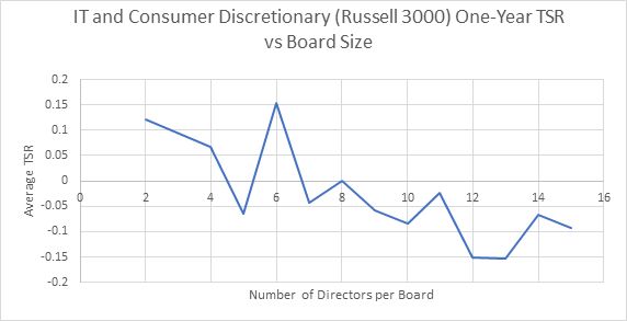 Although these reforms were implemented in the hopes of instigating better governance practices, studies have repeatedly shown that companies with a smaller board size (9.5 directors) outperform companies with a large board (14+) by as much as 8.5% in terms of return. Utilising CGLytics' governance data and analytics, an examination of the two industries in which Uber operates (Information Technology and Consumer Discretionary) appears to corroborate the correlation between a smaller board size and higher shareholder returns.
