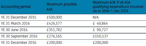 Subject to any change that might be made to the current Finance Bill, the table below summarises examples of the maximum qualifying expenditure that can be claimed as annual investment allowance depending on when the expenditure is incurred.
