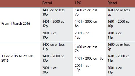 Advisory fuel rates in pence per mile that can be used by employee company car drivers changed from 1 March 2016, with small changes to some of the rates, following the recent stabilisation of pump prices: