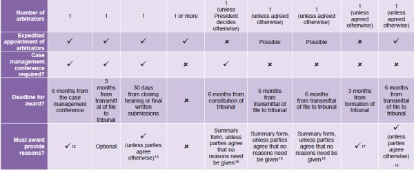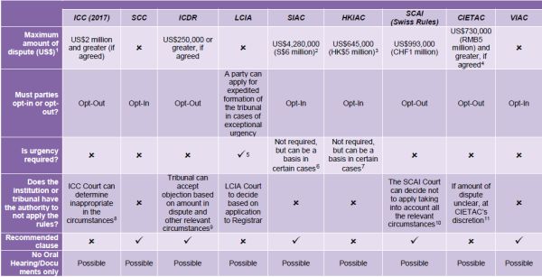 Appendix A (below) summarizes the requirements and expedited procedures under a number of leading institutional arbitration rules.