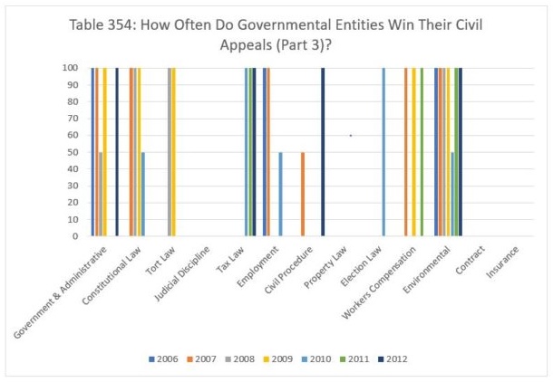 Last week, we began reviewing the winning percentage in civil cases of governmental entity appellants, year by year and one area of law at a time. We began with the years 1994 through 2005. This week, we're reviewing the most recent years, starting today with the data for the years 2006 through 2012.