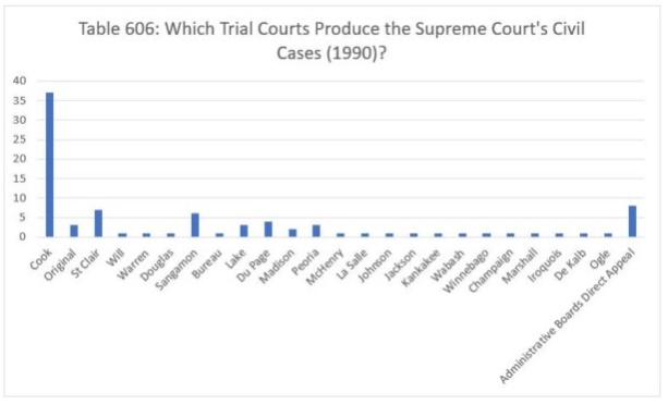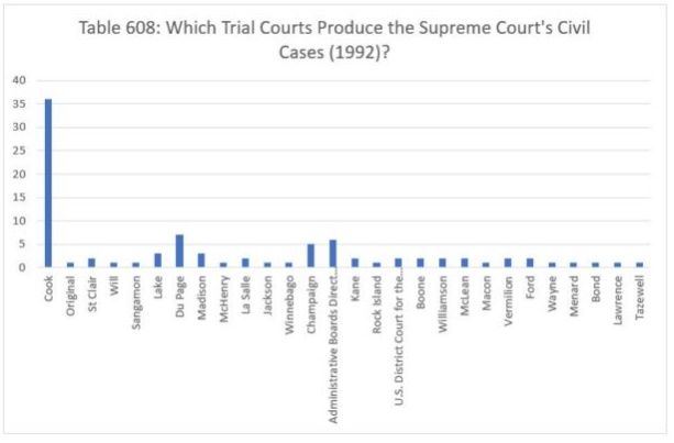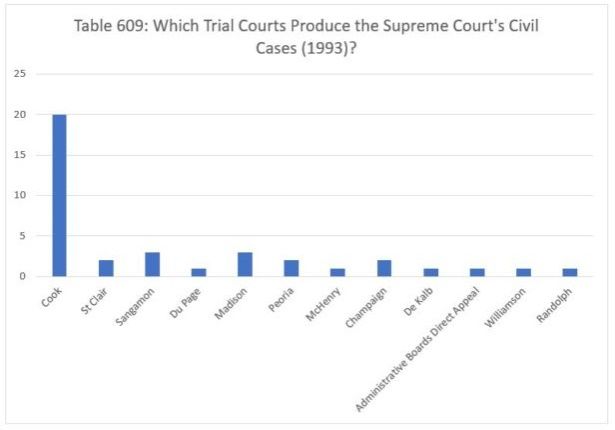 We report the data for 1993 in Table 609. That year, the Court decided twenty cases which originated in Cook County, three each from Sangamon and Madison counties, two from St. Clair, Peoria and Champaign counties, and one case apiece from Du Page, McHenry, DeKalb, Williamson and Randolph counties, and one direct appeal from an administrative board.