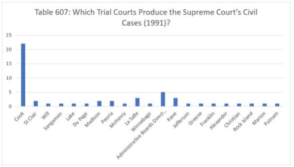 We report the data for civil cases in 1991 in Table 607. The Court decided twenty-two cases from Cook County, five which were direct appeals from administrative boards, three from La Salle and Kane counties, two each from St. Clair, Madison and Peoria counties, and one case each from Will, Sangamon, Lake, Du Page, McHenry, Winnebago, Jefferson, Greene, Franklin, Alexander, Christian, Rock Island, Marion and Putnam counties.