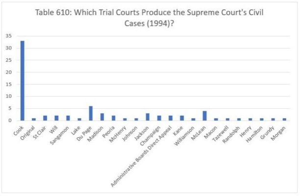 Finally, we review the data from 1994 in Table 610. That year, the Court decided thirty-three civil cases from Cook County, six from Du Page County, four from McLean County, three from Madison and Jackson counties, two each from St. Clair, Will, Sangamon, Peoria, Champaign and Kane counties, and two direct appeals from administrative boards. Finally, the Court heard one case each from the Court's original jurisdiction and from Lake, McHenry, Johnson, Williamson, Macon, Tazewell, Randolph, Henry, Hamilton, Grundy and Morgan counties.