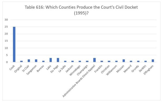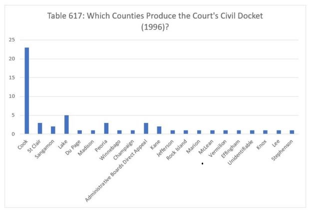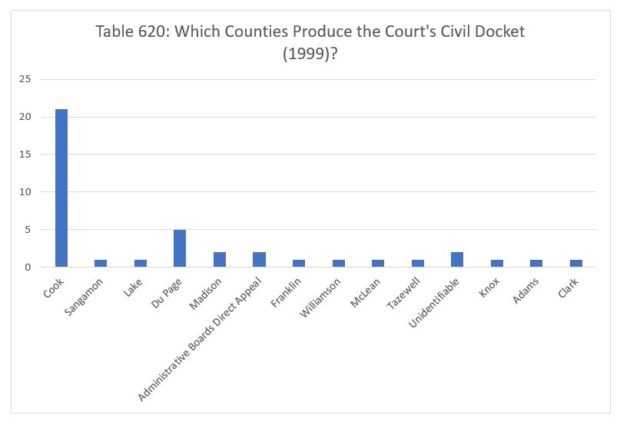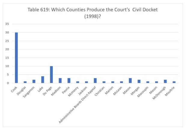 The following year, the Court decided twenty-three civil cases from Cook County. The Court decided five cases from Lake County, three from St. Clair and Peoria counties and on direct appeal from administrative boards, and two each from Sangamon and Kane counties. Finally, the Court decided one case each from Du Page, Madison, Winnebago, Champaign, Jefferson, Rock Island, Marion, McLean, Vermilion, Effingham, Knox, Lee and Stephenson counties, as well as one case for which we couldn't identify the originating county.