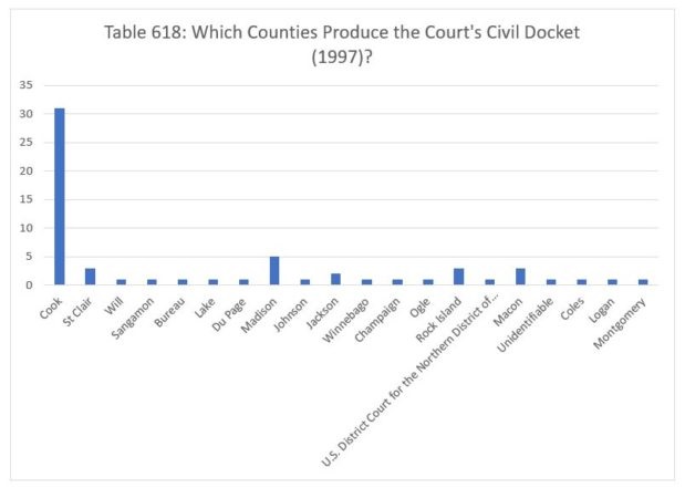 The civil case load from Cook County was up a bit in 1997, as the Court decided thirty-one cases. The Court decided five cases from Madison County, three from St. Clair, Rock Island and Macon counties, two from Jackson County, and one each from Will, Sangamon, Bureau, Lake, Du Page, Johnson, Winnebago, Champaign, Ogle, Coles, Logan and Montgomery counties, one from the U.S. District Court for the Northern District of Illinois, and one final civil case for which we couldn't identify an originating county.