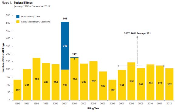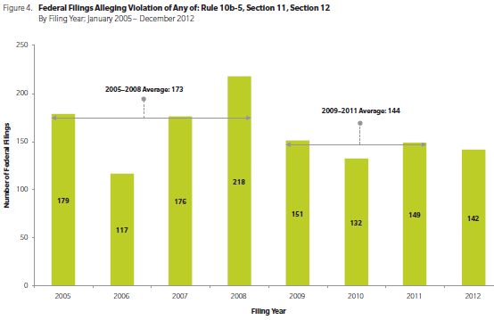 - In 2012, securities class action filings were at their lowest levels since 2007, though the decline in filings was not dramatic