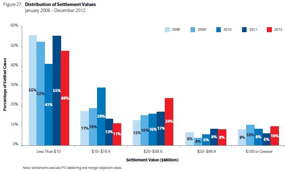 The biggest settlements once again grabbed the biggest headlines in 2012; in particular, the $2.43 billion Bank of America settlement related to its acquisition of Merrill Lynch drew media attention. That settlement has not yet obtained judicial approval, however; therefore, consistent with our protocol, it is not included in our settlement statistics.18