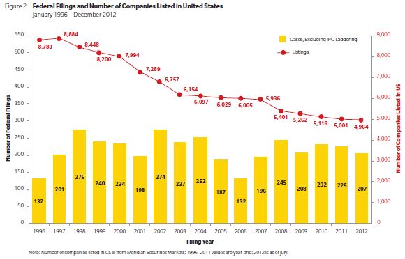 While filings have fluctuated both up and down historically, the number of publicly listed companies in the US has continued to decrease. Another small drop occurred in 2012, bringing the decline since 1996 to more than 43%. The implication of this decline is that an average company listed in the US was 68% more likely to be the target of a securities class action in the last five years than it was from 1996-2000. See Figure 2.