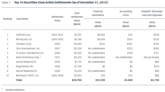 The 10 largest securities class action settlements of all time are shown in Table 1. The new addition to the list in 2012 is the $2.43 billion Bank of America settlement associated with the acquisition of Merrill Lynch announced last year and still pending approval. If approved, it will be the sixth largest settlement ever.