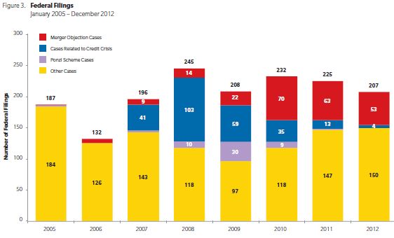 While the wave of credit-crisis related litigation ended in 2012, and the spate of cases with Chinese defendants also abated, merger objection cases continued to fill in much of the gap. In aggregate, the number of securities class action filings in federal courts in 2012 was only slightly below the levels in recent years.