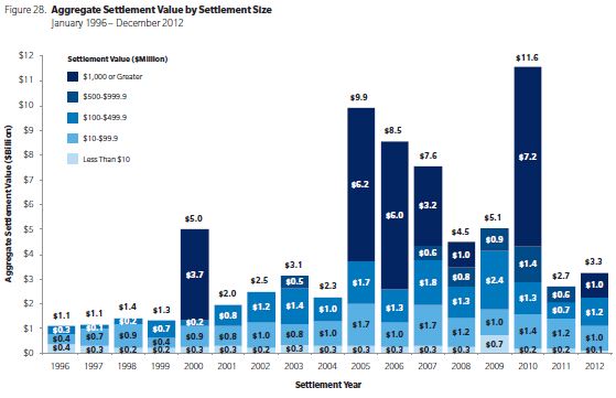 In the figure, it is evident that the large fluctuations in aggregate settlements over the years are driven by the settlements over $1 billion. If those settlements are excluded, aggregate settlements in the years 2007 to 2010 have ranged between $3.5 and $5.1 billion, but decreased to $2.7 billion in 2011 and $2.3 billion in 2012.