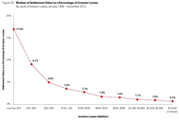 In general, settlement sizes grow as investor losses grow, but the relationship is not linear. Settlement size grows less than proportionately with investor losses, based on analysis of data from 1996 to 2012. Small cases typically settle for a higher fraction of investor losses (i.e., more cents on the dollar) than larger cases. For example, the median settlement for cases with investor losses of less than $20 million has been 17% of the investor losses, while the median settlement for cases with investor losses over $1 billion has been 0.7% of the investor losses. See Figure 29. Our findings on the ratio of settlement to investor losses should not be interpreted as the share of damages recovered in settlement but rather as the recovery compared to a rough measure of the "size" of the case.