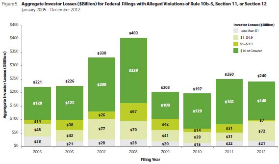 Aggregate investor losses for 2012 were slightly below the level observed in 2011, but they have been generally increasing since 2009. Although about half of the cases filed between 1996 and 2012 have investor losses of less than $500 million, in total these cases account for only 5% of aggregate investor losses. The bulk of aggregate investor losses is represented by a handful of cases in each year with investor losses of more than $10 billion, so that most year-to-year variation in aggregate investor losses is the result of variation in these large cases.