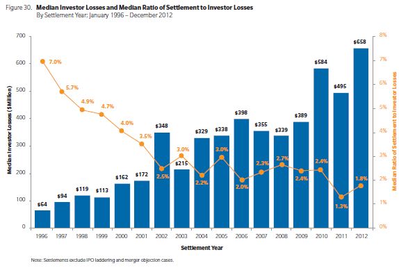 Median investor losses for settled cases have been steadily increasing since the passage of the PSLRA. As just described, the median ratio of settlement to investor losses decreases as investor losses increase. Indeed, the increase in median investor losses over time translated to a decrease of the median ratio of settlement to investor losses. In 2012, the ratio was 1.8%. See Figure 30.