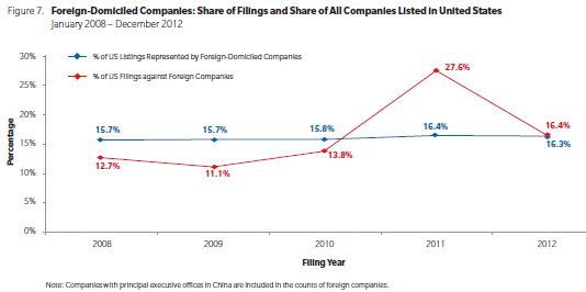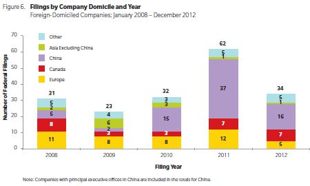 In 2011, a record number of cases were filed against foreign issuers, with a total of 62. More than half of those cases (37) reflected a surge of filings against companies domiciled or with principal executive offices in China. Filings against Chinese companies dropped significantly in 2012, though, with only 16 suits filed. See Figure 6. Filings against all foreign-domiciled companies were also down in 2012, and back to their pre-2011 levels. As mentioned in our mid-year 2012 report, the requirements for listing in the US through the reverse merger process have become more stringent, including the requirement that the company trade elsewhere for a one-year "seasoning period."6 Additionally, The Wall Street Journal has reported that the number of Chinese companies listed on the NYSE and Nasdaq has declined 20% since 2010.7