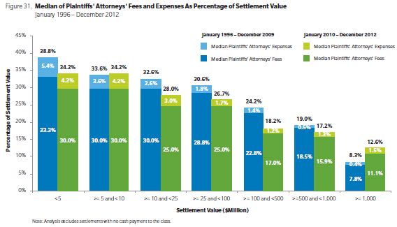 Typically, fees and expenses grow with settlement size but less than proportionally, i.e., the percentage fees and percentage expenses shrink as the settlement size grows. Here, we describe the patterns taking the period 2010–2012 as an example. For settlements below $5 million, median fees and expenses represented 34.2% of the settlement. This percentage falls with settlement size, reaching 12.6% for settlements above $1 billion.