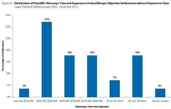 We report fees for federal merger objection cases separately, because merger objections often settle with no payment to investors. Many merger objection cases are voluntarily dismissed at the federal level because a parallel state action settled; these cases are excluded from Figure 32, below.