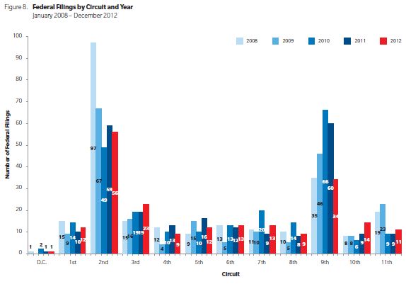 Filings continue to be concentrated in two US circuits: the Second Circuit, including New York State, and the Ninth Circuit, including California. In 2012, 56 cases were filed in the Second Circuit and 34 in the Ninth, accounting for over 43% of all filings. Filings in the Ninth Circuit dropped significantly, however, and were about half of the previous year's level. This level was one of the lowest since 1996, after the passage of the Private Securities Litigation Reform Act (PSLRA). See Figure 8.