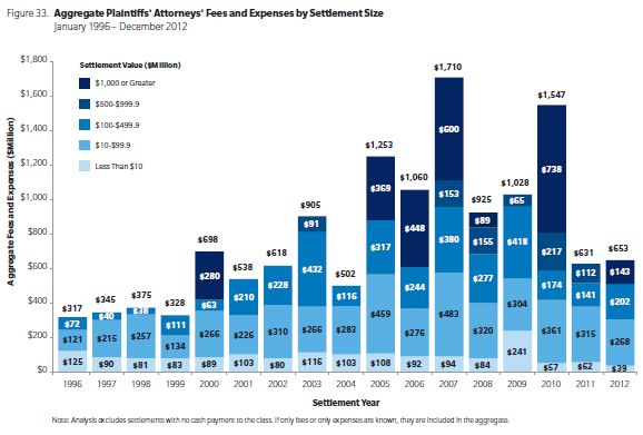 Aggregate plaintiffs' attorneys' fees and expenses for all federal settlements were $653 million in 2012. This amount represents an increase of 4% compared to last year, but is well below the levels received in the period 2007-2010—even if the aggregate fees in that period corresponding to settlements exceeding $1 billion are excluded.