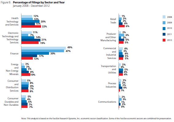 Filings against primary defendants in the finance sector have continued to decline, from a peak of nearly half of all securities class actions during the credit crisis years of 2008 and 2009, to less than 13% in 2012. Companies in the electronic technology and technology services industry have been targeted slightly less frequently this year, accounting for 19% of filings in 2012, down from 21% in 2011.