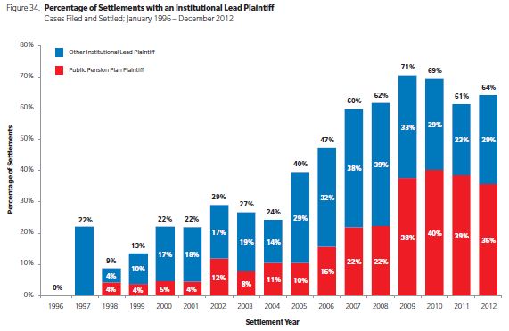 In 2012, 64% of securities class actions had an institutional lead plaintiff; which is slightly above 2011's percentage and slightly below the 2009 peak of 71%. See Figure 35 for more detail on institutional and public pension fund lead plaintiffs.