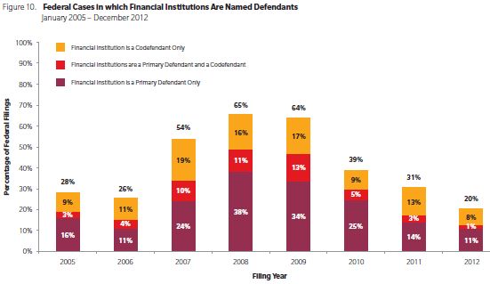 8 Note that in Figure 10 the percentages of federal cases in which financial institutions are named as defendants is computed on the basis of the first available complaint.