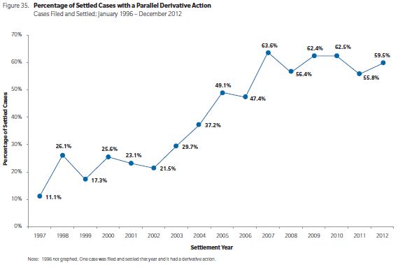 Securities class actions are sometimes accompanied by derivative actions based on similar or identical allegations. The prevalence of these "tag along" derivative actions has been increasing over the last 10 years, and they were filed in 60% of the securities class actions that settled in 2012. Our research has found that the presence of a derivative action is associated with larger settlements for investors in the class action.