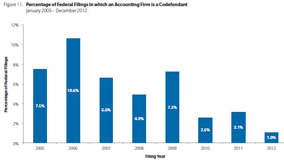 In our mid-year 2012 report, we noted that this trend might be the result of changes in the legal environment. The Supreme Court's Janus decision in 2011 restricted the ability of plaintiffs to sue parties not directly responsible for misstatements, and as a result, auditors may only be liable for statements made in their audit opinion. This decision, along with the Court's Stoneridge decision in 2008, which limited scheme liability, may have made accounting firms unappealing targets for securities class action litigation.