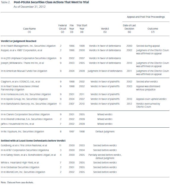 21 In past editions of "Trends" we had reported all class actions that went to trial after the PSLRA, including those that were filed before the PSLRA.