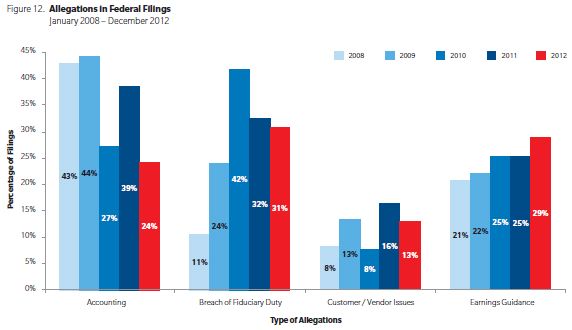 In 2012, 31% of filings contained allegations of breach of fiduciary duty, similar to the percentage in the previous year. Allegations involving misleading earnings guidance continued to increase to 29% of complaints in 2012, up from 21% in 2008 and 25% in 2011. Almost a quarter of filings included accounting allegations, down from 44% in 2008-2009, at the height of the wave of credit crisis litigation. The decline in accounting allegations may also explain some of the reduction in cases with accounting codefendants. See Figure 12.