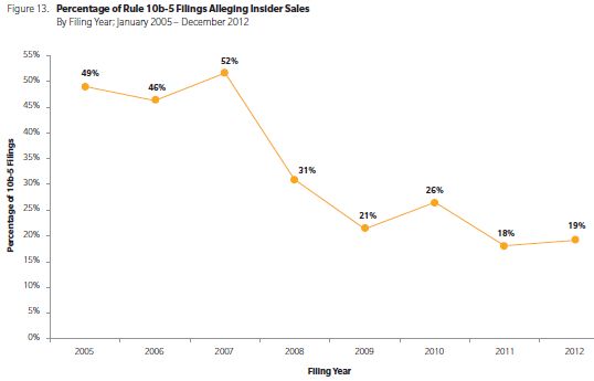 In 2012, 19% of class actions with Rule 10b-5 allegations also alleged insider sales, which is slightly higher than the fraction observed in the prior year. However, the share of such filings has been drifting downward, with 2012 at just over one-third the level in 2007. See Figure 13.