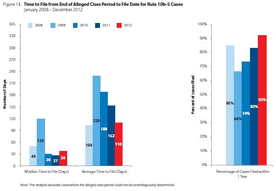 Plaintiffs' attorneys have been responding to stock price drops with ever-increasing speed, and the time from the end of the alleged class period to first filing has been decreasing since 2009. In 2012, the average time to file was 110 days, down from a high of 229 days in 2009 and 153 days in 2011. The percentage of cases that are filed within one year has unsurprisingly also been increasing, from 66% in 2009 to 92% in 2012. See Figure 14.