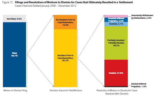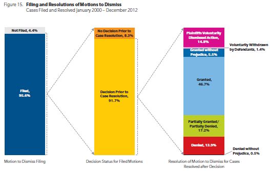 The stated success rate for motions to dismiss reflects the outcome at the time the case was resolved. More motions to dismiss that were successful might have been overturned, but instead resulted in settlements before further appeals were concluded. About 8% of cases in which the motion to dismiss was granted with prejudice or in its entirety resulted in settlements.