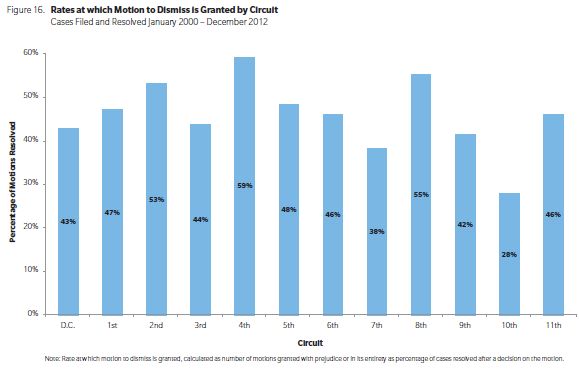 In total, then, 31% of cases continued past the motion to dismiss, at least in part. In an additional 5% of cases, dismissal was granted, though without prejudice.