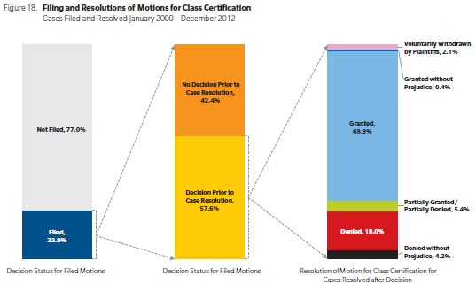 The fraction of classes certified has fallen slightly in recent years. For cases filed in 2005 or before, 76% were certified, while the figure is 72% for more recent cases. This difference, however, is not statistically significant.