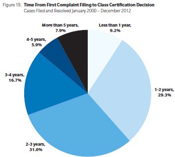 While relatively few cases proceed to the point at which a decision on class certification is reached, the cases that get to this point provide a measure of the overall speed of the legal process. For cases with a decision, more than three-quarters of such decisions came within three years of the original filing date of the complaint. See Figure 19. The median time is about 2.3 years. The speed of the process has remained relatively constant over time, with cases filed before 2006 getting to class certification in about the same time as cases filed later.