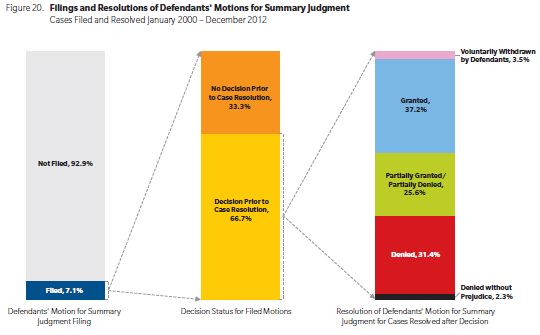 Motions for summary judgment are comparatively rare. Only 9% of resolved cases saw such a motion filed by either side of the litigation. In all but a handful of these cases, the motion for summary judgment was filed by defendants. See Figure 20 for details on the outcomes of summary judgment motions filed by defendants.