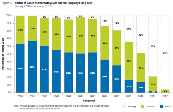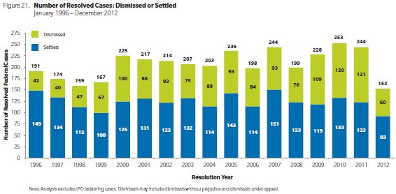 In sharp distinction to the relatively stable pace of new case filings, 2012 saw the fewest settlements since at least 1996. The number of dismissals was the lowest since 1998. The slow rate of both dismissals and settlements suggests that the litigation process as a whole proceeded more slowly in 2012.