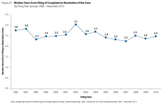 Median time to resolution has oscillated between 2.3 and 3.1 years in the period 1996-2010 and has been remarkably stable, between 2.3 and 2.5 years, in the sub-period 2005-2010, if IPO laddering cases and merger objection cases are excluded. See Figure 23.