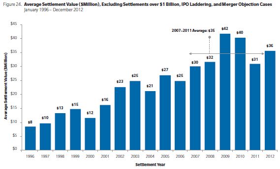The average settlement amount in 2012 was $36 million, which is within the range of average settlement amounts in recent years. See Figure 24. The average settlement amount in 2012 is slightly above the $35 million average over 2007-2011. The average calculation excludes settlements above $1 billion, settlements in IPO laddering cases, and settlements in merger objection cases. The settlements over $1 billion have a large impact on averages, while the IPO laddering cases and merger objection cases are atypical; inclusion of any of these may obscure trends in more usual cases.