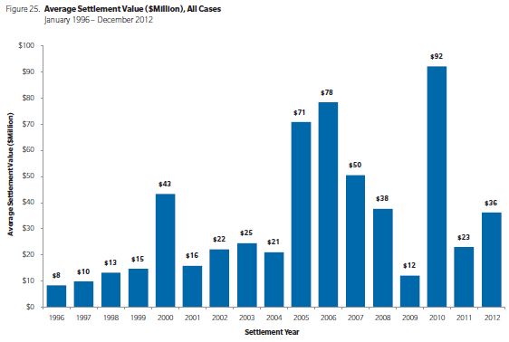 For the modest number of cases that were actually settled in 2012, settlement values were near their average level of recent years, up from the relatively low level of 2011. Plaintiffs' attorneys' fees, by contrast, have decreased.