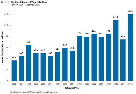 This figure also shows an increasing trend in median settlement amounts between 1996 and 2012, from $3.7 million in 1996 to $12.0 million in 2012, a 324% increase. Naturally, part of this increase is due to inflation. After adjusting for inflation, the 1996 median settlement was $5.5 million and the increase from then to 2012 was 218%.
