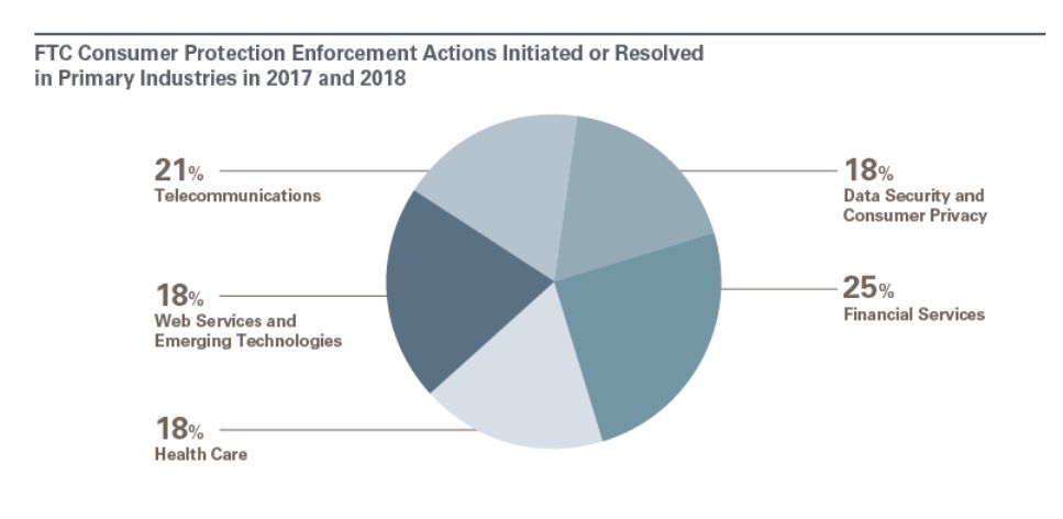 In terms of specific industries or markets subject to FTC scrutiny, we expect the Commission will continue to focus its enforcement efforts in the following five industries: financial services, web services and emerging technologies, data security and consumer privacy, telecommunications, and health care. Of the 186 consumer protection actions initiated or resolved by the FTC in 2017 and 2018, 163 actions (88 percent) involved one of these five industries.1