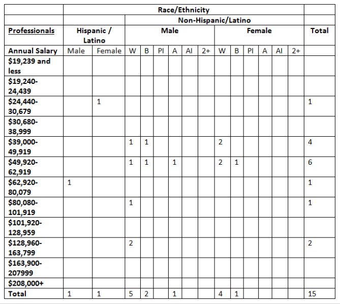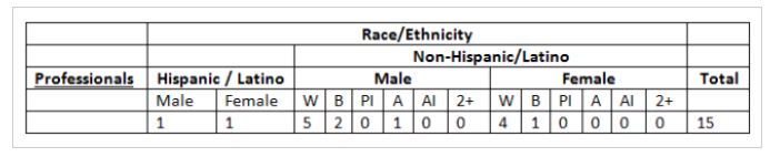 Let's look at an example for an employer who has 15 employees in the "Professionals" job category (which encompasses a wide variety of positions including HR specialists, accountants, IT analysts, and engineers). Under the current reporting requirements, the employer's EEO-1 report would look something like this: