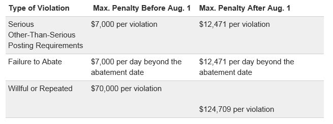 OSHA's maximum penalties will increase by 78 percent. The following chart illustrates the penalty increases: