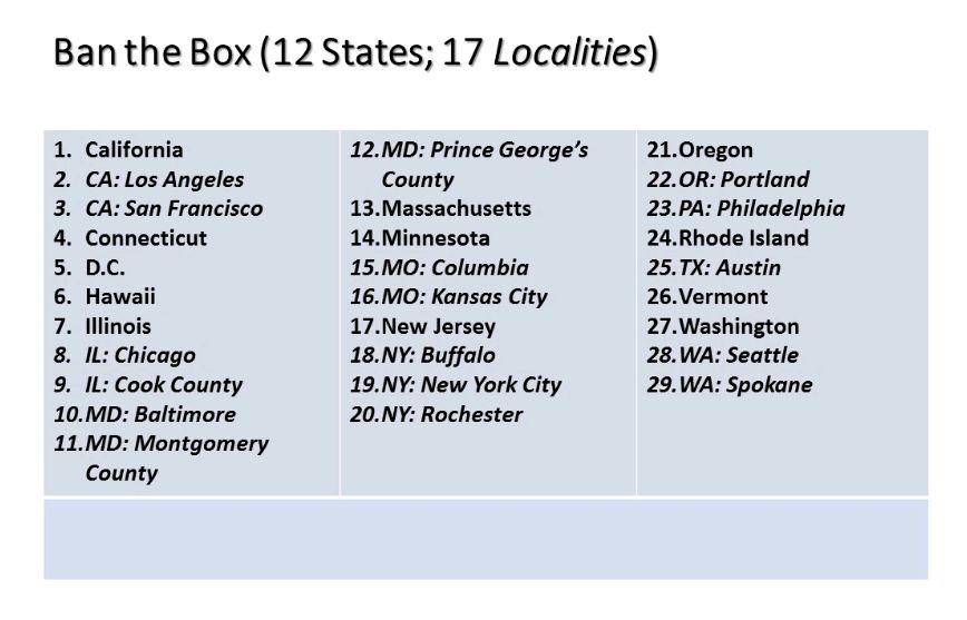 Given the huge impact that the variety and differences in approach among the different state and local ban the box laws have had on employers—particularly those that operate in multiple jurisdictions or recruit nationwide—some policymakers have begun to question the cost of different ban the box initiatives on employers. To this end, New Jersey, Indiana, and Michigan have instituted laws that limit local ban the box laws. Thus, as the ban the box movement seems to be accelerating among certain jurisdictions (particularly in the western United States), other jurisdictions seem to be pumping the brakes. While this "banning the ban" movement is in its infancy, it remains to be seen how it will impact other states and regions.