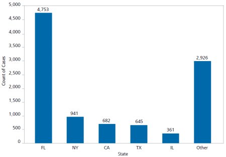 Of the 10,000 FLSA cases filed in US District Courts during the past two years, over 45% were filed in Florida.5 Other jurisdictions with a large number of FLSA filings include California, Illinois, New York, and Texas. Together these five states account for over 70% of the FLSA filings in 2007 and 2008. See Figure 2 for claim filings by state over the past two years.